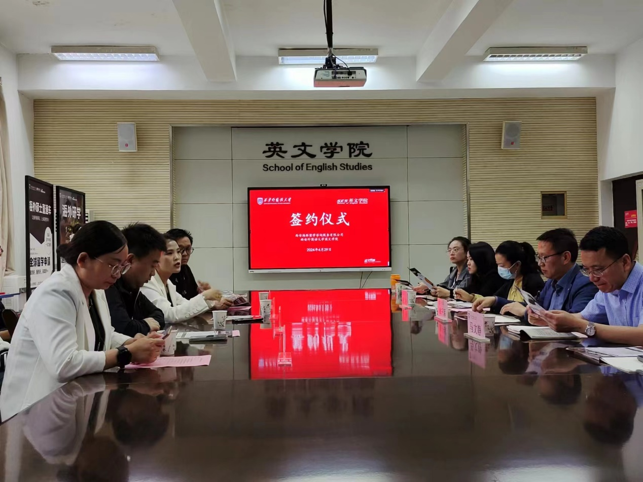 与西安海豚留学咨询服务有限公司在教学楼G209会议室签订合作协议。海豚留学咨询服务有限公司创始人韩正怡、运营经理赵文清、高级留学规划师郭力铭、苏阿妮、香香漫画