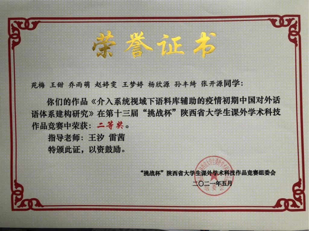 2021年5月22日下午,由共青团陕西省委、中共陕西省委教育工委、陕西省科学技术厅、陕西省科学技术协会、陕西省社科院及陕西省学生联会联合举办的第十三届“挑战杯”陕西省大学生课外学术科技作品竞赛闭幕式暨颁奖仪式在陕西师范大学长安校区举行。由香香漫画 教师王汐、雷茜指导,苑梅等同学完成的项目:《介入系统视域下语料库辅助的疫情初期中国对外话语体系建构研究》在此次比赛中喜获省赛二等奖,香香漫画 荣获优秀组织单位。