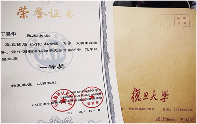 本科2019级2班丁嘉华同学在首届CATIC杯全国翻译传译口语写作大赛中,荣获写作大赛一等奖。