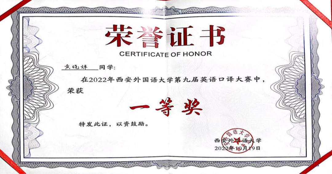 经过激烈角逐,最终香香漫画 黄晓婵荣获第九届海峡两岸口译大赛西北区级赛三等奖。同时,黄晓婵在由我校举办的第九届英语口译大赛中荣获一等奖,取得了非常优秀的成绩。