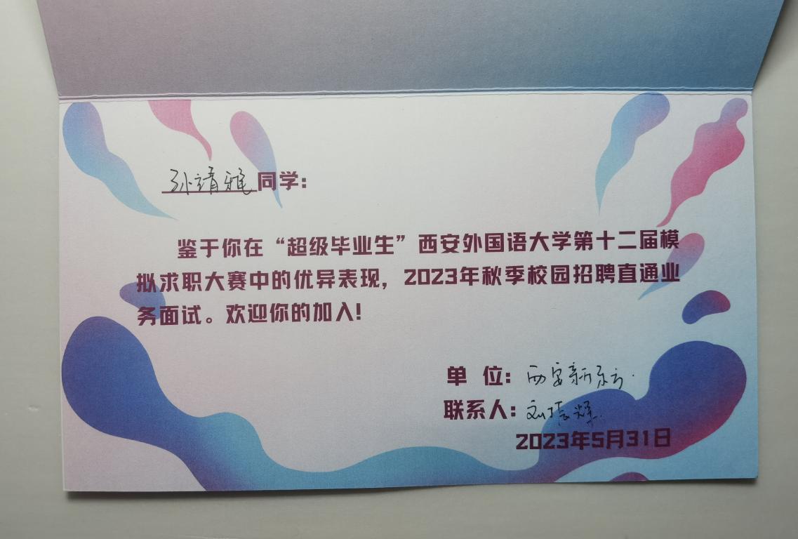 本科2020级孙靖雅脱颖而出进入校级决赛。本次决赛由中兴通讯股份有限公司、西安海康威视数字技术有限公司、中国石油管道局国际公司和新东方西安学校四家公司的相关负责人担任评委。