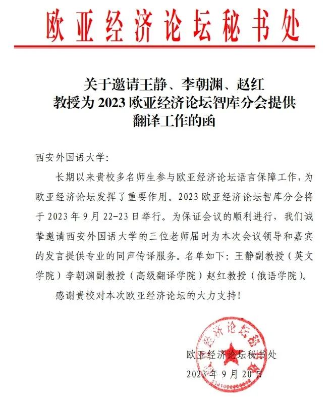 活动期间,王静副教授所在团队分别完成了论坛相关同声传译、交替传译、陪同口译和媒体采访等语言服务,分别为欧亚经济论坛欢迎晚宴、欧亚经济论坛智库分论坛以及欧亚论坛媒体采访报道等提供同声传译和交替传译服务。