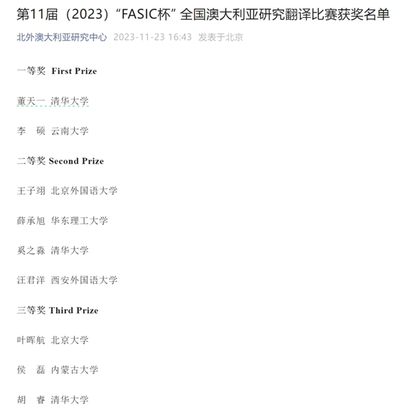 2023年11月23日,第11届(2023)“FASIC杯”全国澳大利亚研究翻译比赛获奖名单公布。由香香漫画