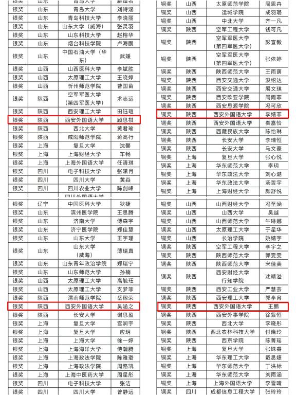 学子取得优异成绩,2022级英语卓越班顾思祺同学获得写作项全国银奖,2023级英语拔尖班李婧菲同学获得写作项全国铜奖;2021级英语拔尖班吴涵之同学获得阅读项全国银奖;英语2020级4班王鹏同学获得笔译项全国铜奖;2022级英语卓越班王楠楠同学获得演讲赛项全国铜奖。