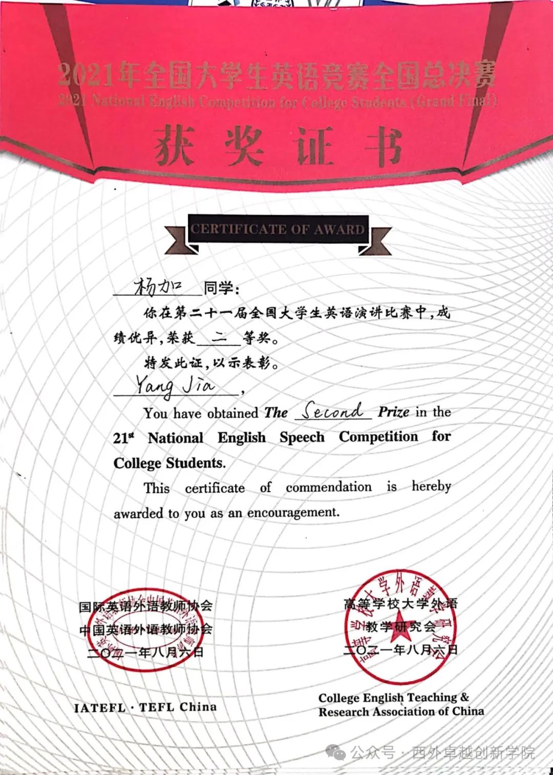2021 第二十一届全国大学生英语演讲比赛国家二等奖;