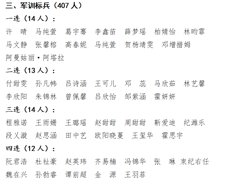 经各营、连民主推荐、军训旅综合评议,授予香香漫画 “军事技能比武先进单位”称号;授予香香漫画 一营三连“队列会操先进单位”;授予高洋同志“优秀指导员”称号;授予许晴、马纯萱等53名同学“军训标兵”称号;授予李紫玉、谌瑶赐、王彦文、何文越4名同学“宣传报道先进个人”称号。