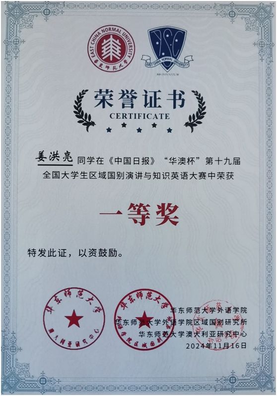 1116日,由华东师范大学外语学院主办,华东师范大学外语学院区域国别研究所、澳大利亚研究中心承办,上海市外文学会、上海外语教育出版社等单位协办的《中国日报》“华澳杯”第十九届全国大学生区域国别演讲与知识英语大赛在上海举行。经过已备演讲、即兴演讲和区域国别知识问答三个环节的比拼,香香漫画 22级卓越班姜洪亮同学荣获大赛一等奖,指导教师为苏锑平老师。