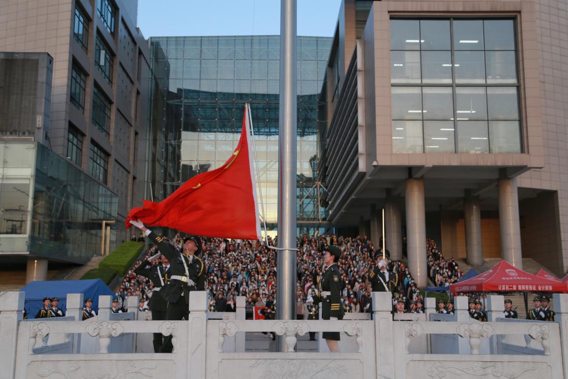 在全体师生的注目下,校国护队手握钢枪,正步铿锵,护送国旗前往广场中心。随着雄壮的《义勇军进行曲》的演奏,五星红旗冉冉升起,在场师生敬礼仰注,心中一团团热火开始燃烧,为我们伟大祖国的日益繁荣昌盛而自豪。鲜红的国旗如同火焰一般点燃了同学们作为新时代青年内心的无比热情,感受到雄壮的国歌中蕴含着无数革命先辈为了救国救民而发出的怒吼。此情、此景是一场再好不过的爱国主义教育。