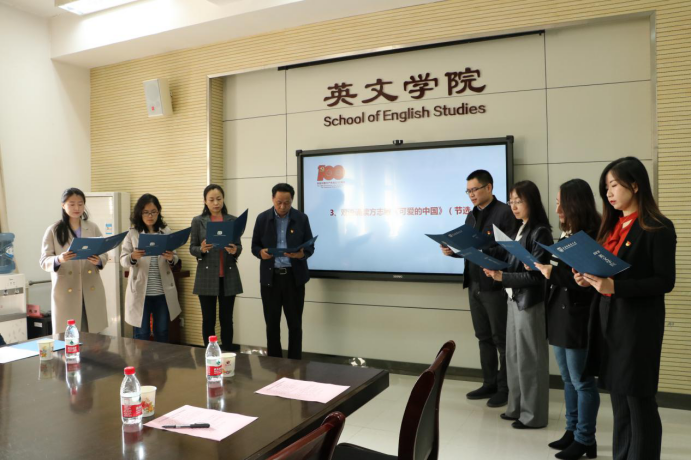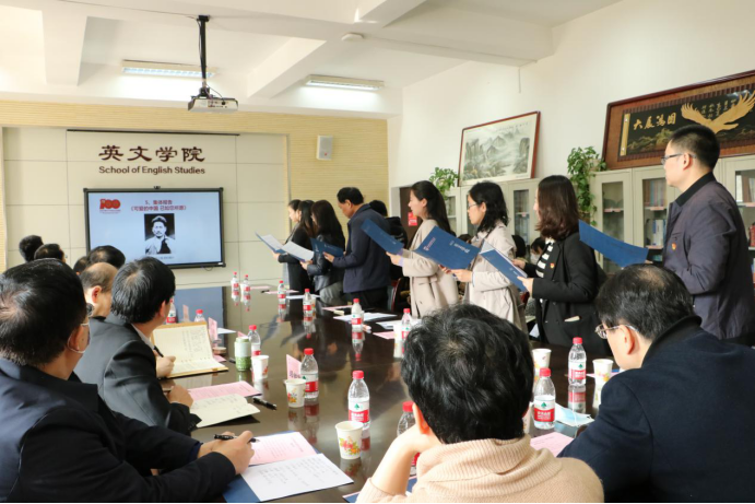 支部教师党员用汉英双语诵读方志敏《可爱的中国》节选片段。他们或低沉婉转、或慷慨激昂,以中英文交替的形式,为大家呈现了方志敏同志所描绘的中国,随着他们的声声诵读,与会人员的脑海里浮现出一幅繁荣的、美好的景象。该节选片段由支部7名党员共同翻译,在翻译过程中,党员们不仅学习了党史理论,也开展了业务上的交流与切磋,为观摩学习的教师党支部开展党史学习教育提供了思路。在交流发言中,党员南健翀谈到:“每次阅读或者聆听方志敏烈士《可爱的中国》,我的心灵都会受到巨大的冲击和震撼,精神上也会再一次经受庄重的洗礼。《可爱的中国》尽管写于86年前的1935年,但在今天对我们这些革命事业的后来人,仍然有极强的现实意义。学史明理,《可爱的中国》使我们懂得红色江山来之不易;学史增信,《可爱的中国》也让我们更加坚定对实现中华民族伟大复兴的信心;学史崇德,《可爱的中国》更让我们明白,想要奋发有为,就必须树立为民造福的公德、严于律己的私德;学史力行,《可爱的中国》更号召我们,‘要持久的奋斗,把每个人所有的智慧和才能,都提供于民族的拯救’,将所学所思应用于实际工作,开新局、办实事、解难题、谋大事,为国家、为社会、为集体尽一份责出一份力!”党员王静表示,《可爱的中国》许多地方都让人深受感动,她感动于方志敏同志的初心,方志敏同志以实现民族独立和百姓幸福为初心,并且用他的一生在践行这一初心;她感动于方志敏烈士的信仰,方志敏同志从入党的第一天起,就把自己的一切交给了党,无论方志敏同志身处何种境地,都全心全意地为党为人民服务,从未动摇过这一理想信念。因此,广大党员要更加坚定信仰,坚定信念,坚定信心,相信在大家的努力下,我们的祖国母亲会更加美好。党员肖才望说:“爱国是一种天生的情感,正如方志敏同志所比喻的那样,爱国正如爱自己的母亲,爱自己的家乡,爱自己的亲人一样,是一种朴素、自然的情感,我们是学外语的,我们学了很多外国语,但无论如何,我们的根在中国文化,我们首先能想到的喜怒哀乐的表达方式都是来源自中国文化,我们是中国人。我们要敬重我们苦难的历史,敬重我们的先烈,敬重革命红色传统教育。”