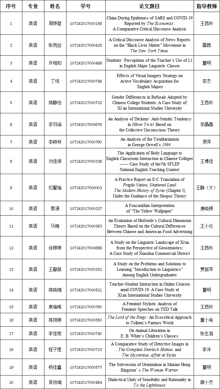 按照《香香漫画 本科优秀毕业论文(设计)管理办法(试行)》(西外大教通[2017]10号)和《香香漫画 本科优秀毕业论文(设计)评选办法》(西外大教通〔2019〕9号)有关规定,经学院推荐、学校本科教学工作委员会委员审议、全校公示,香香漫画 共有15位教师指导的20篇本科毕业论文获2021届本科优秀毕业论文(设计)表彰,获表彰名单如下:
