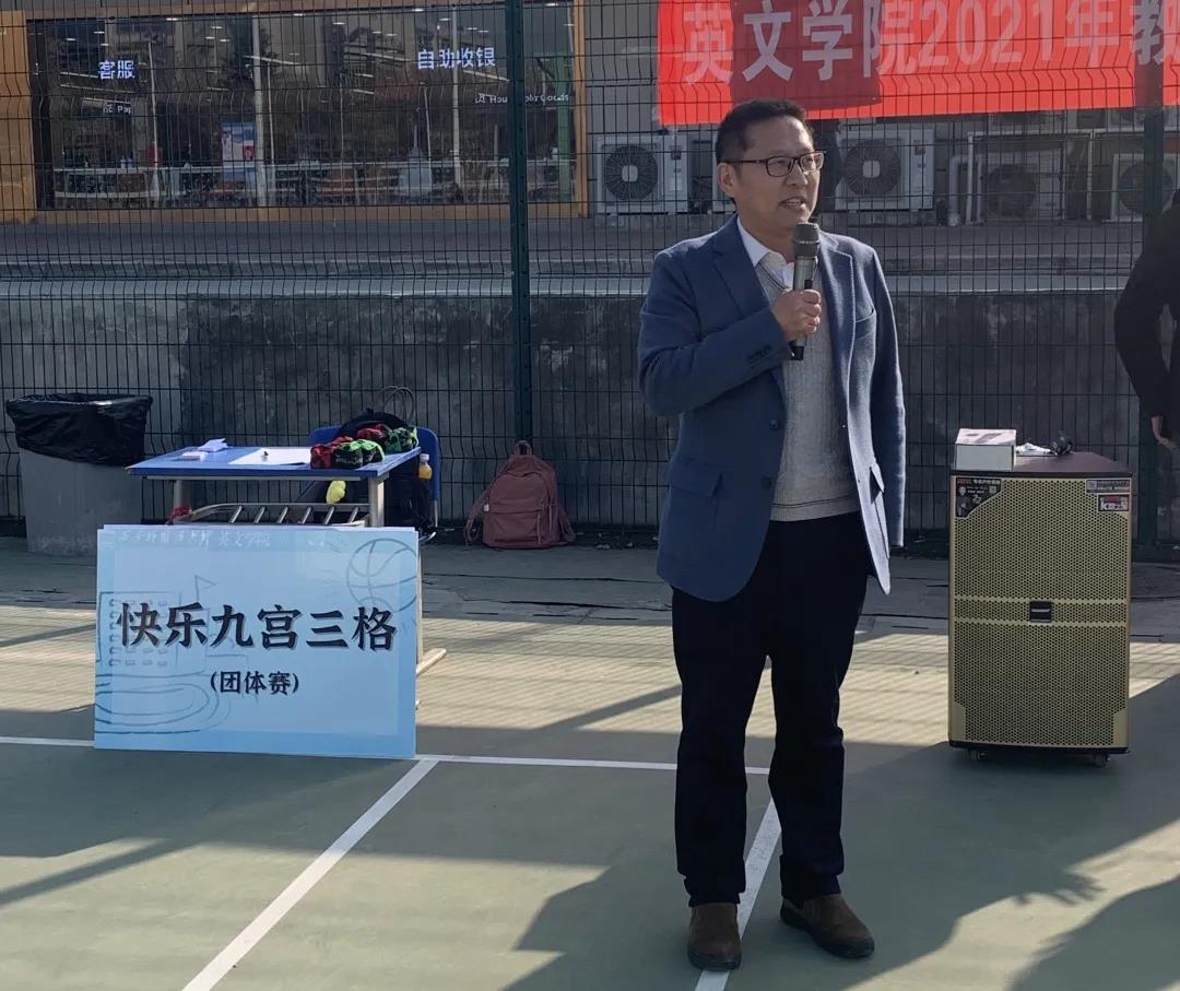本次趣味运动会共设置团体赛一项,个人赛四项。在快乐九宫三格团体比赛中,老师们摩拳擦掌、跃跃欲试、斗智斗勇、相互配合,表现出了极强的团队协作意识和当仁不让的竞技状态。赛场上,加油声呐喊声不绝于耳,选手们观众们气氛高涨。经过三轮的激烈比拼,英语文学系的五位参赛老师合力赢得了快乐九宫三格团体比赛的冠军,学院院长南健翀代表学院向冠军队颁发了冠军奖杯,对他们的拼搏精神给予了充分肯定。