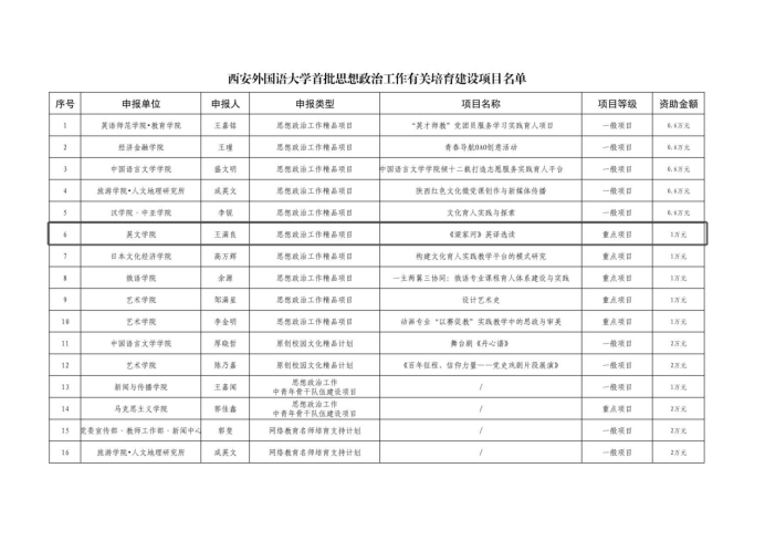 据悉,本次全校共有16个项目入选首批思想政治工作有关培育建设项目。该项目主要分为“思想政治工作精品项目”“网络教育名师培育支持计划”“思想政治工作中青年骨干队伍建设项目”“原创校园文化精品推广行动计划”等类型,目的在于深入学习贯彻习近平新时代中国特色社会主义思想,全面贯彻全国教育大会、全国高校思想政治工作会议和学校思想政治理论课教师座谈会精神,推动全校加快构建思想政治工作体系,不断提升思想政治工作质量。
