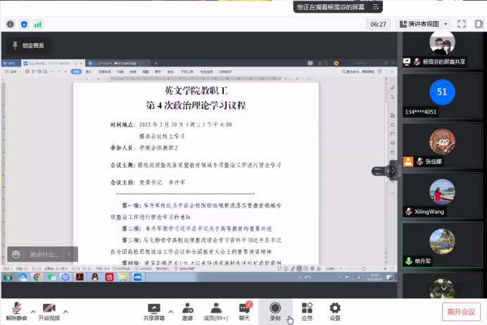 通过线上方式召开本学期第四周政治理论学习会,全体教职工通过腾讯会议参加,会议由党委书记单升军主持。