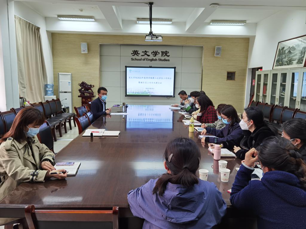 在长安校区教学楼G209召开2022年春季学期第三次学工例会暨辅导员工作作风建设会,学院党委副书记马文静、学工秘书李哲和全体辅导员参加了会议,会议由马文静主持。