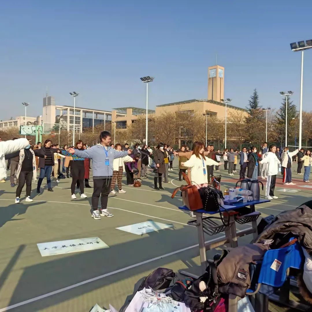 动员讲话后,为了保障大家安全参赛,学院组织大艺团舞蹈队的同学带领全体参赛老师和裁判员进行了集体热身。老师们整齐的动作和一丝不苟的表情,都在表示着一展身手的信心。