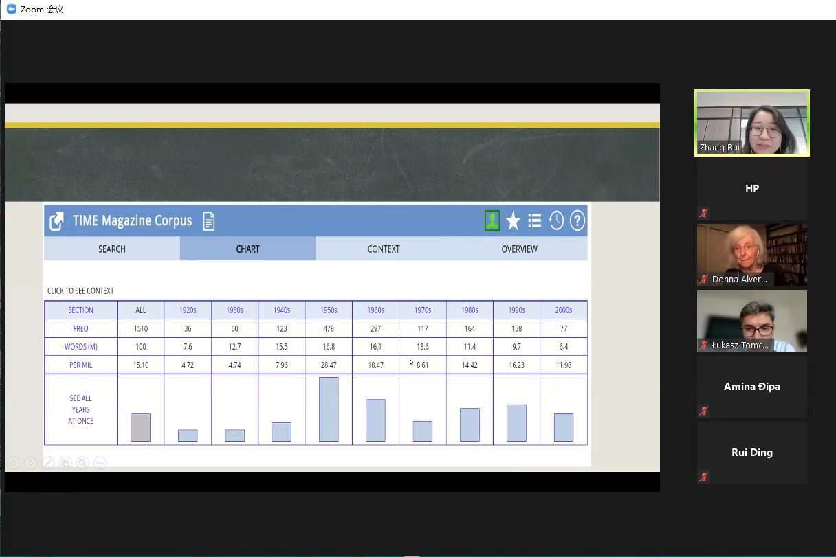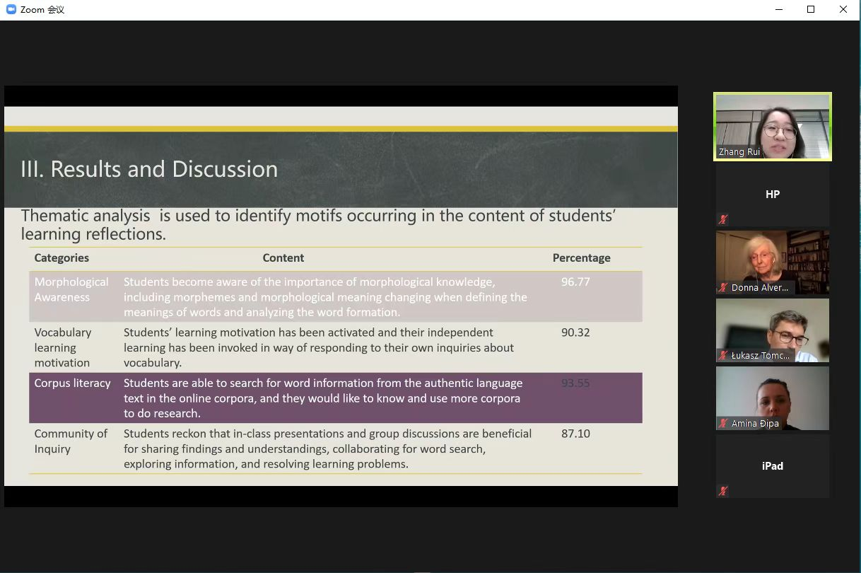 会议伊始,张蕊博士从研究背景出发,提出如何在第二语言词汇教学中丰富学生的语言形态学知识,进而帮助其英语词汇学习的研究问题。张蕊博士介绍了通过课堂行动研究的方法,训练学生利用COCA、BNC、TIME MAGAZINE Corpus等在线语料库检索英语单词,进行小组讨论以及课堂展示,并记录了学生的学习反思过程。研究证明,基于语料库的方法不仅扩展了学生的语言形态学知识、丰富了学生的词汇储备,还培养了学生积极使用在线语料库探索单词的动机,发展了学生的语料库应用技能。此外,学生的合作学习能力以及自我调节学习动机被充分调动,自我效能感得到激发。最后,张蕊博士指出未来的相关研究可以在其它语言的词汇课堂中验证在线语料库辅助语言形态学知识发展的有效性。
