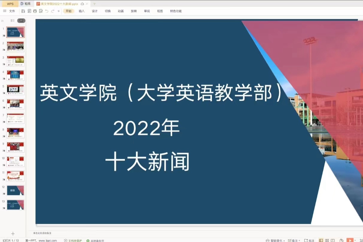 (大学英语教学部)2022年十大新闻,分别是汲取力量,认真学习贯彻党的二十大精神;强化引领,党的建设成果丰硕;以赛促学,专业竞赛摘金夺银;孜孜不倦,教育教学成效显著;润物无声,课程思政全面推进;精心组织,科学研究硕果累累;拼搏进取,体育竞赛捷报频传;共克时艰,疫情防控风雨同舟;砥砺奋进,团学工作多点开花;立德树人,双语党课特色彰显。并传达了学校《关于做好2023年寒假期间有关工作的通知》精神。
