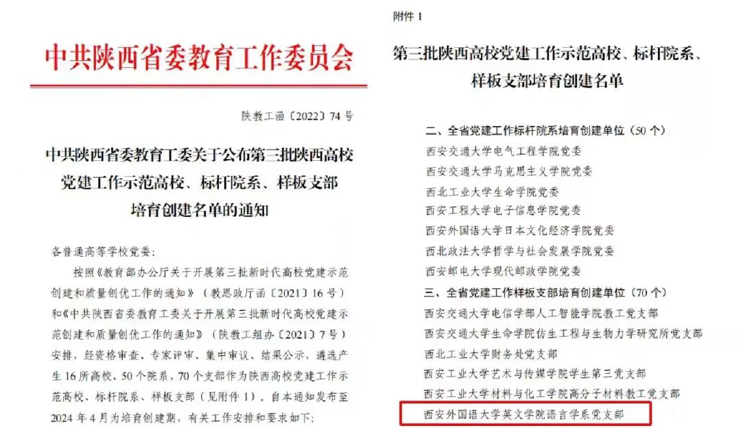 2022年,我们以习近平新时代中国特色社会主义思想和党的二十大精神为指导,不断加强党建引领作用,取得丰硕成果。语言学系党支部入选“全省党建双创样板支部”培育创建名单,写作教研室被授予“陕西省教科文卫体系统五一巾帼标兵岗”称号,6名师生党员获校级“优秀共产党员”和“优秀党务工作者”,1个支部获校级“先进基层党组织”,1个主题党日获学校“优秀主题党日”,1个项目获批学校党建工作“一院一品”项目立项,2名教师获学校课程思政“教学标兵”。党委理论学习中心组开展学习研讨16次,开展周三教职工政治理论学习36次。召开党委会12次,召开党政联席会27次。举办3期双语党课,举办2次积极分子培训班和2次发展对象培训班,确定入党积极分子531人,发展党员303名。举办院级课程思政大练兵,开展“大思政课”大讨论。以党建促发展,不断引领教学科研、管理服务、人才培养、国际交流以及群团工作等取得喜人成果。