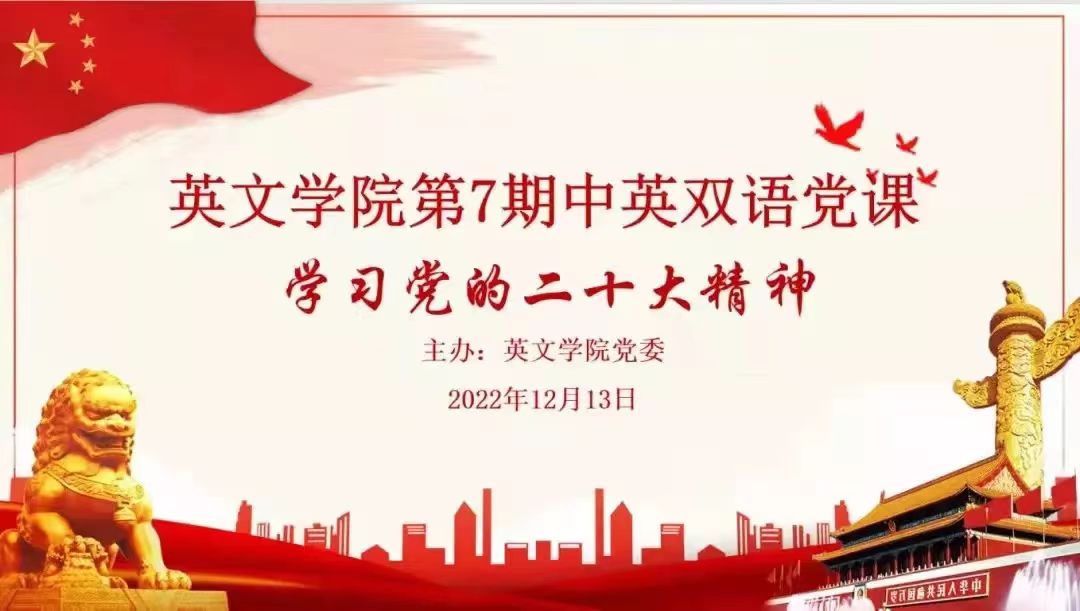 2022年,我们加强理想信念教育,注重党员教育管理,突出英语专业特色,围绕“学习贯彻党的十九届六中全会精神”“深入学习《习近平谈治国理政》第四卷”“学习党的二十大精神”,共举办三期中英双语党课。党课培训坚持理论和实际相结合、线上教学和自主学习相结合、党员思想教育和自我教育相结合,采取双语专题辅导、自主学习和心得分享等多种形式,共1000余人次学生党员参加。双语党课是学院党委统筹推进党性教育和专业教育的重要举措,是大思政格局视野下立德树人的生动实践,也是探索具有专业特色的浸润式思政教育新模式。