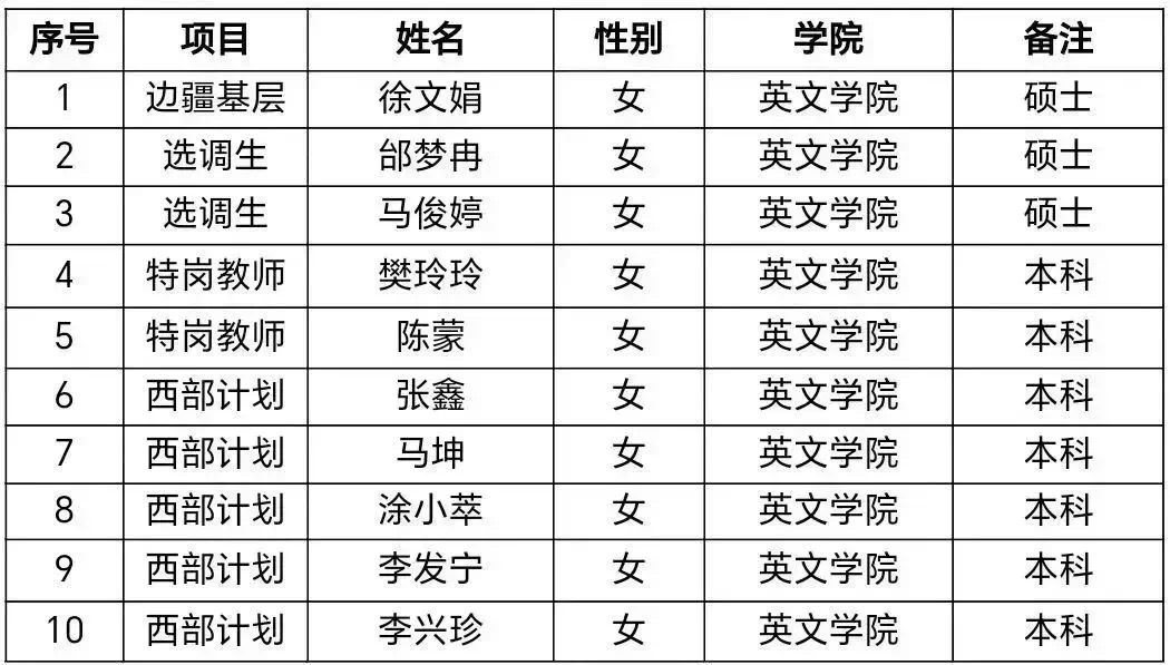 进一步强化学生思想引领,厚植学生家国情怀,大力宣传艰苦边远地区基层就业政策办法,在学校奖励的基础上制定学院基层就业激励奖励办法,多次开展“特岗教师”“三支一扶”“选调生”“西部计划”等大学毕业生基层就业项目的精准动员、精准宣讲工作。同学们怀揣梦想、志存高远、响应号召、踊跃报名,最终10名优秀毕业生通过不同项目的招募选聘、考察考核等程序,顺利踏上征程,赴基层一线人民最需要的地方贡献青春力量。
