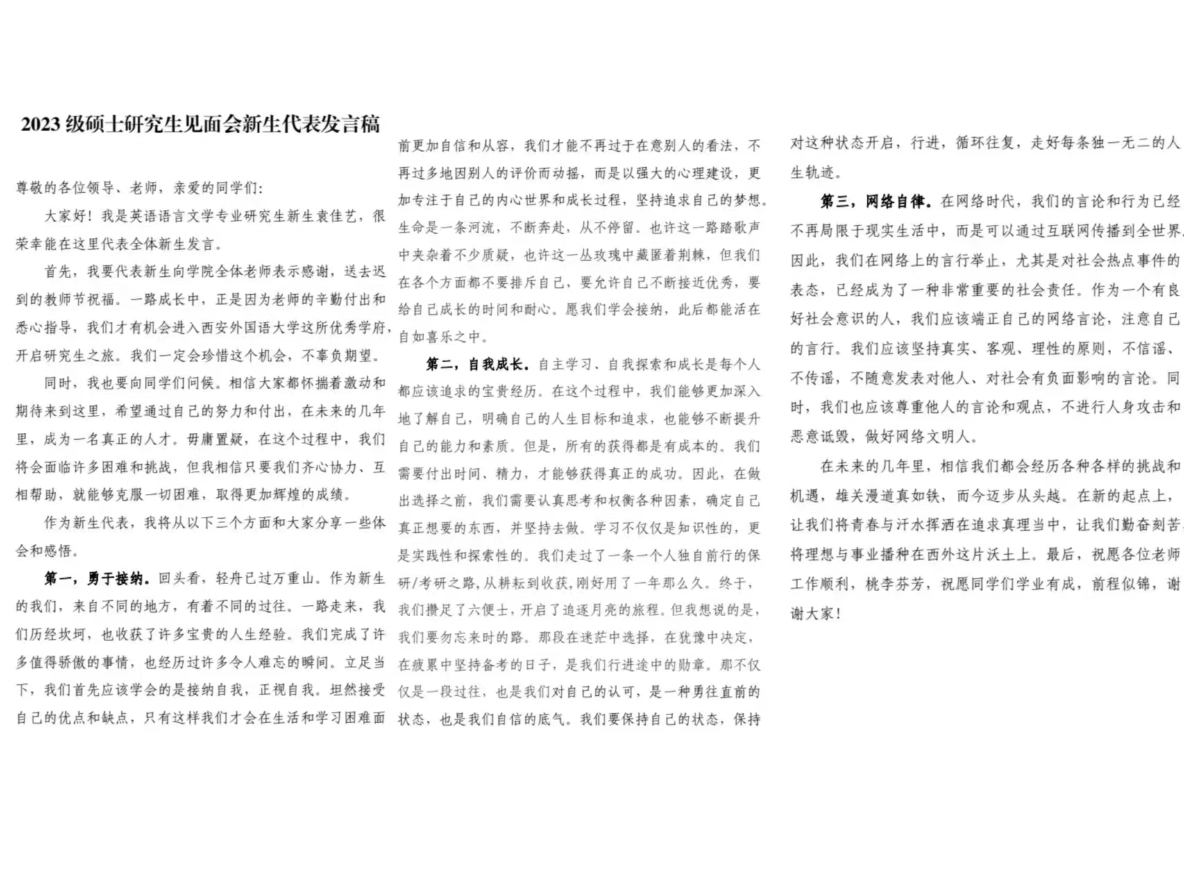 研究生国家奖学金获得者、2021级翻译学专业硕士研究生董昉昊、2023级英语语言文学专业硕士研究生袁佳艺分别作为老生、新生代表发言。