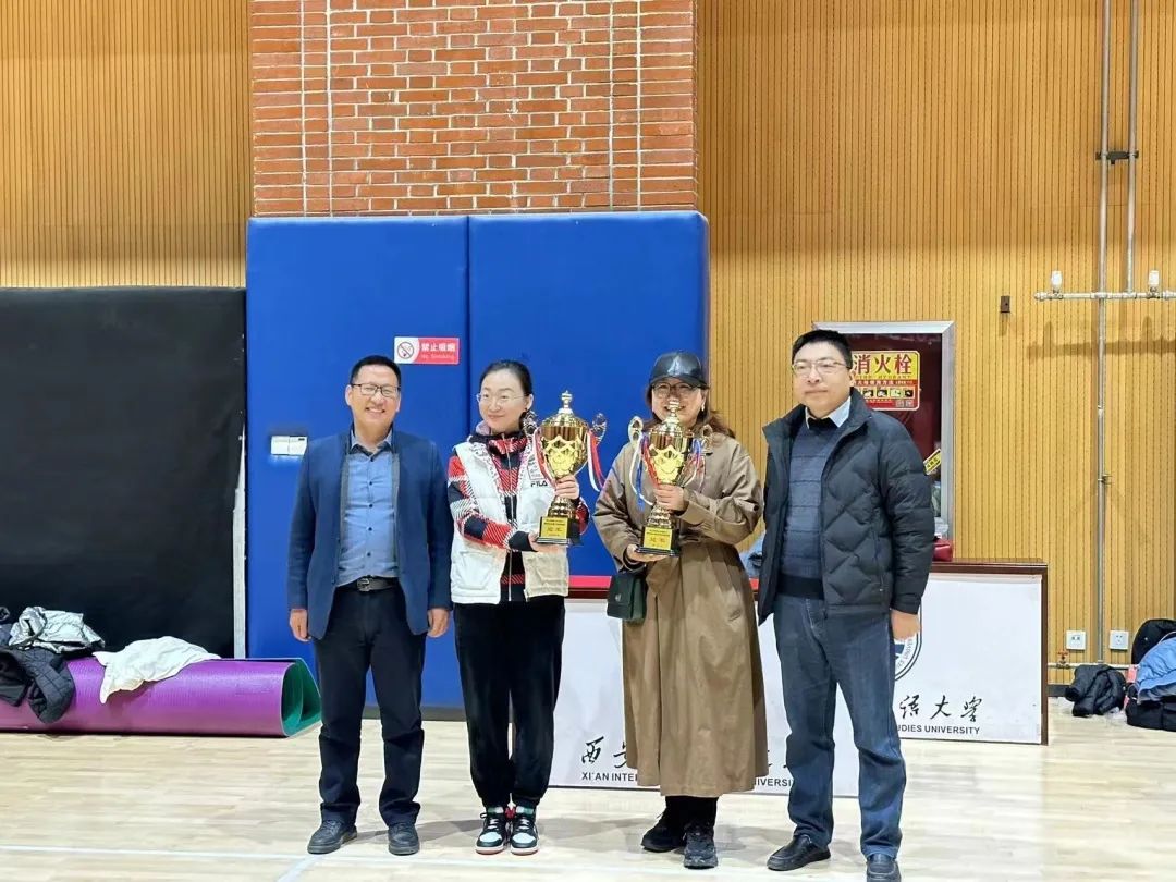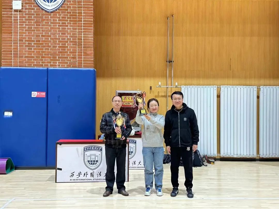本次趣味运动会共设置团体赛两项,个人赛四项。在“快乐九宫三格”和“携手奋进”团体比赛中,老师们摩拳擦掌、跃跃欲试、斗智斗勇、相互配合,表现出了极强的团队协作意识和当仁不让的竞技状态。赛场上,加油声呐喊声不绝于耳,选手们观众们气氛高涨。经过几轮激烈比拼,大学英语教研室蝉联“快乐九宫三格”和“携手奋进”的团体赛冠军。团体赛后,学院党委书记单升军、党委副书记马文静、副院长裴等华、雷茜代表学院向获奖队伍颁发奖杯,对他们的拼搏精神给予了充分肯定。