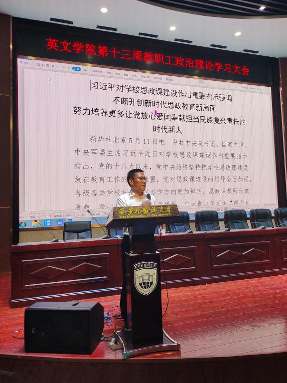 会上,党委书记单升军领学了习近平总书记对学校思政建设作出重要指示精神,强调学院将加大课程思政建设力度,全力推进“三进”工作,认真组织“课程思政大练兵”活动;全体教师要扎根三尺讲台,潜心教书育人,努力通过课堂达到“价值塑造、能力培养、知识传授”相融,确保专业课程与思政课程同向同行、同频共振,共同培育更多让党放心、爱国奉献、担当民族复兴重任的外语人才。