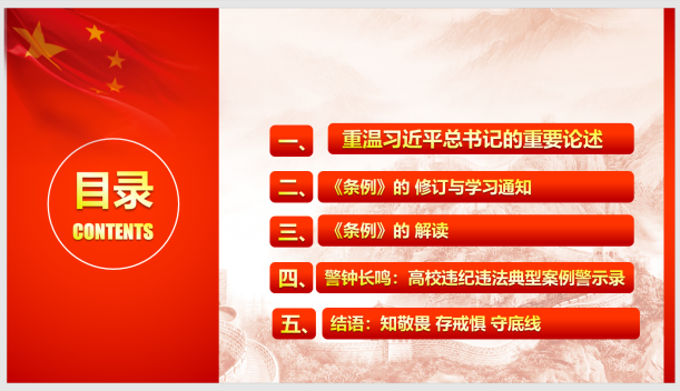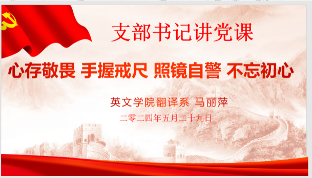翻译系开展支部书记讲党课活动,翻译系党支部书记马丽萍主讲,全体教师参加学习。马丽萍首先介绍了由中央文献出版社出版、中共中央党史和文献研究院编辑的《习近平关于全面加强党的纪律建设论述摘编》一书,并通过重温习近平总书记围绕全面加强党的纪律建设发表的一系列重要论述,加深了全体教师对政治纪律和政治规矩的根本性和重要性的认识,深化了把维护党中央权威和集中统一领导作为最根本的政治纪律和政治规矩的理解。通过视频、图文的方式介绍了《条例》的修订与学习的通知要求,让党员与非党员教师认识到党纪学习教育不仅要坚持逐章逐条学、联系实际学还要以案促学,主动深入学,注重融入日常、学用结合。之后,结合陕西省高校的五个警示案例,从学生工作、出国纪律、科研经费报账、解决问题极端行为五个方面敲响警钟,结合《条例》的细读,照镜自警,心存敬畏,手握戒尺,不忘立德树人的教育初心。要时刻保持对政治纪律的敬畏心和敏锐性,持之以恒深学细悟,将政治纪律和政治规矩内化为干事处世、言行举止的基本准则,真正做到心有所畏、言有所戒、行有所止。