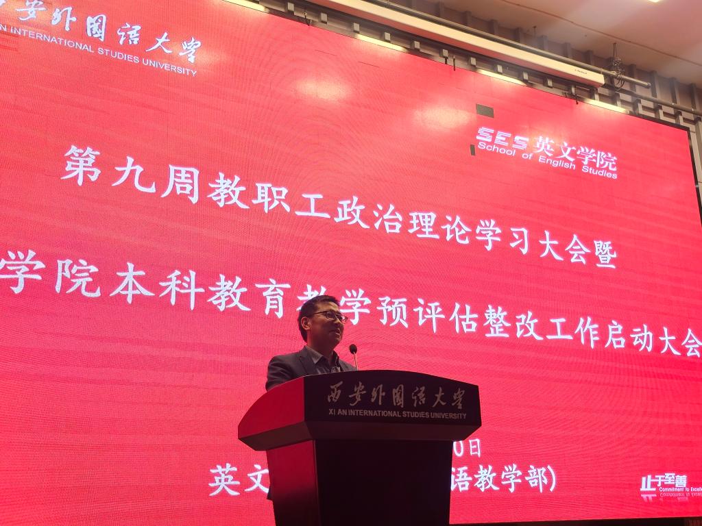 在长安校区教学楼A区111报告厅召开第九周政治理论学习会暨本科教育教学审核评估预评估反馈意见整改启动会。会议由党委书记单升军主持,全体教职工参加会议。