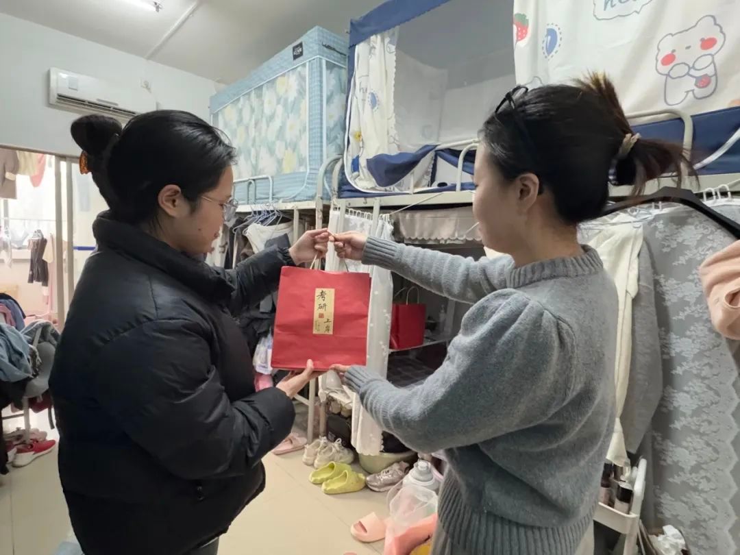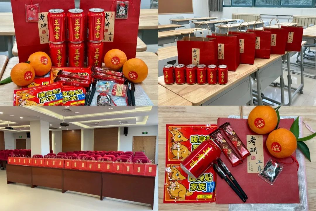 随后,老师们为同学们发放了学院精心准备的考研礼包。精美的礼品袋上醒目印着“考研上岸”,承载着学院对考研学子的美好祝福;学习文具,愿同学们在考场上挥洒自如;香甜脆脆鲨,预示着先苦后甜的收获;特制的饮料别具匠心,瓶身印着每位学子的名字与祝福语,一口清凉,唤醒疲惫身心,给予精神鼓舞;金灿灿的橙子,寄托着学院对考研学子们的祝福。每一份物品都承载着学院的关怀与期待,温暖着每一个为梦想拼搏的心灵。