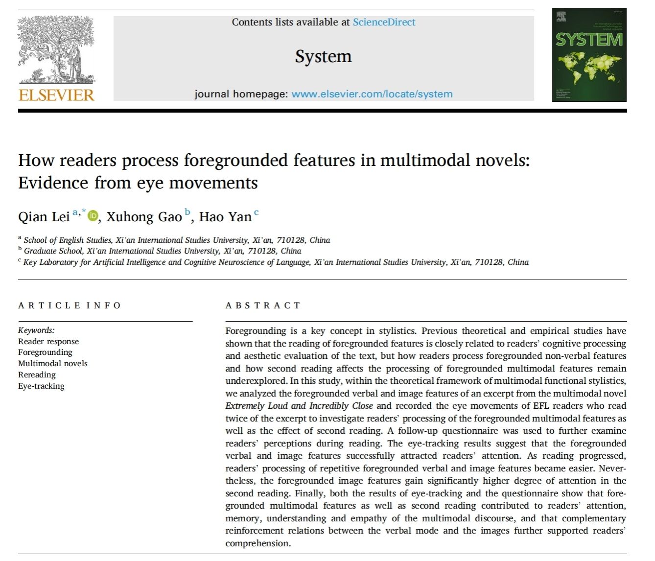 近日,我院雷茜教授团队在语言学国际顶级期刊System发表最新科研成果“How readers process foregrounded features in multimodal novels: Evidence from eye movements”(读者如何加工多模态小说中的前景化特征:来自眼动实验的证据)。