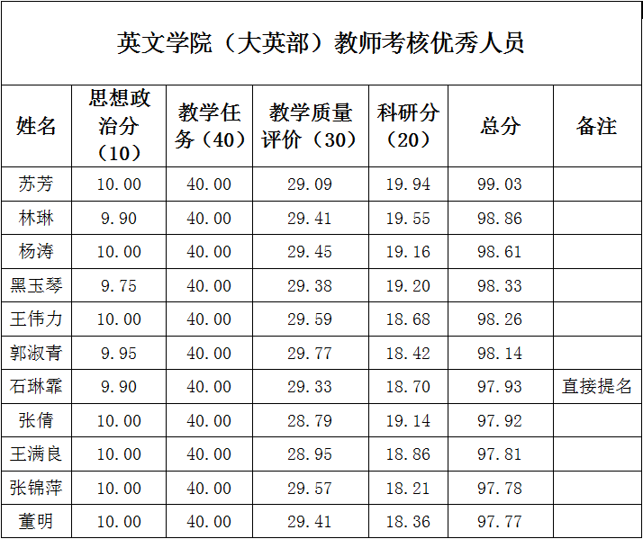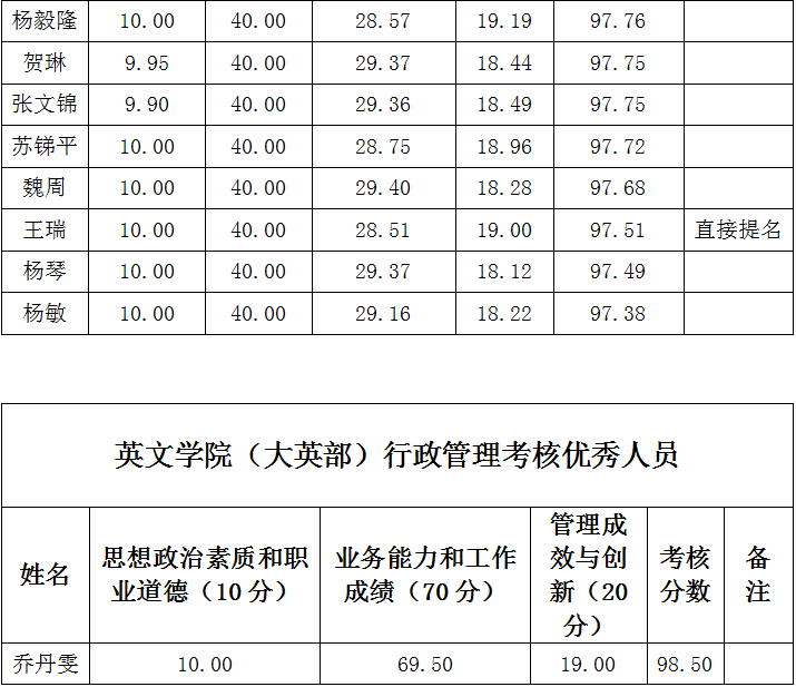 同时,年度为获批国家社科基金项目主持人或荣获陕西省高等教育教学成果奖二等奖及以上主持人或荣获陕西省哲学社会科学优秀成果二等奖及以上第一完成人或陕西省及以上教学名师获得者或陕西省高校课堂教学创新大赛一等奖及以上获得者满足基本条件(一)(二)条不受考核总分及评教分数限定可直接评定为优秀等次。鉴于学院行政人员已达5人,根据15%确定优秀比例,2022年可确定1名优秀人选。鉴于大学英语教学部为相对独立处级单位,挂靠香香漫画