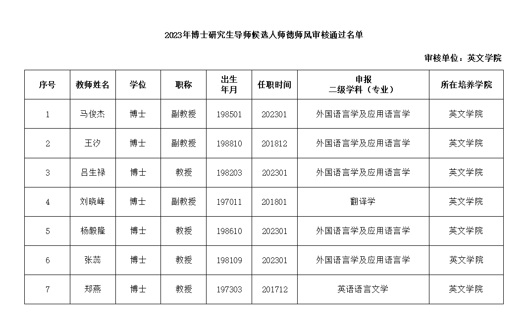 根据研究生院关于开展2023年博士研究生指导教师遴选工作的通知,经个人申报,学院审查申请人政治意识、师德师风、学术道德及立德树人等方面,现将通过2023年博士研究生导师申请人师德师风审核结果予以公示(按姓氏笔画排序)。