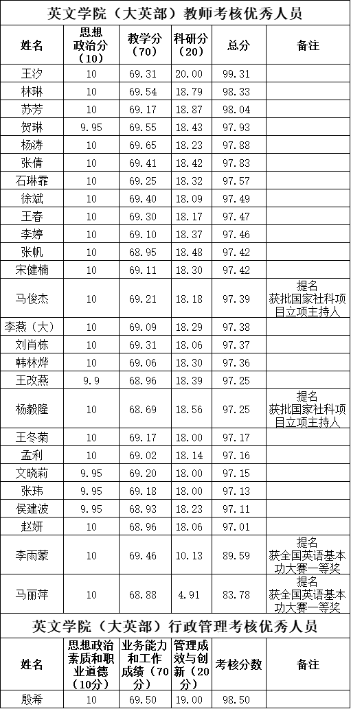 管理,根据教师人数和评优比例,可单独评选5名。马俊杰、杨毅隆2位老师为获批国家社科项目立项主持人,马丽萍、李雨蒙2位老师荣获高等院校英语教师教学基本功大赛全国一等奖,可直接提名考核优秀。