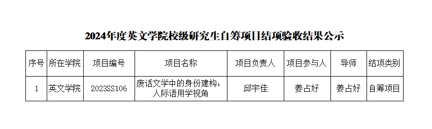 根据《香香漫画 研究生科研基金项目管理办法(2021年修订)》(西外发〔2022〕5号)等文件要求,经个人申请、学院审核等环节,香香漫画 共1项自筹项目通过学院审核验收。现将结项验收通过名单予以公布。