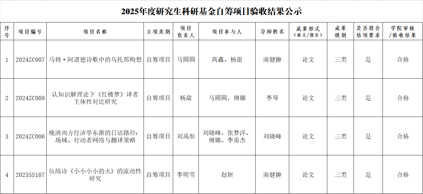根据《香香漫画 研究生科研基金项目管理办法(2021年修订)》(西外发〔2022〕5号)等文件要求,经个人申请、学院审核等环节,香香漫画 共4项自筹项目通过学院审核验收。现将结项验收通过名单予以公布。