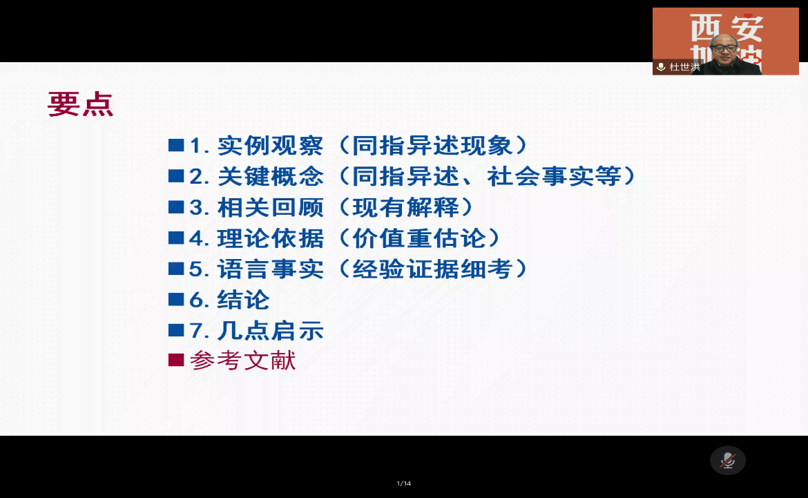 会议末端,杜教授对本次讲座内容进行总结。言语社群或个人对同一社会事实进行不同的表述(同指异述),其背后反映的是正向(或负向)的价值重估或者持续价值重估,并对有关此项研究的进一步深入分析,提出了一些启发性的建议。