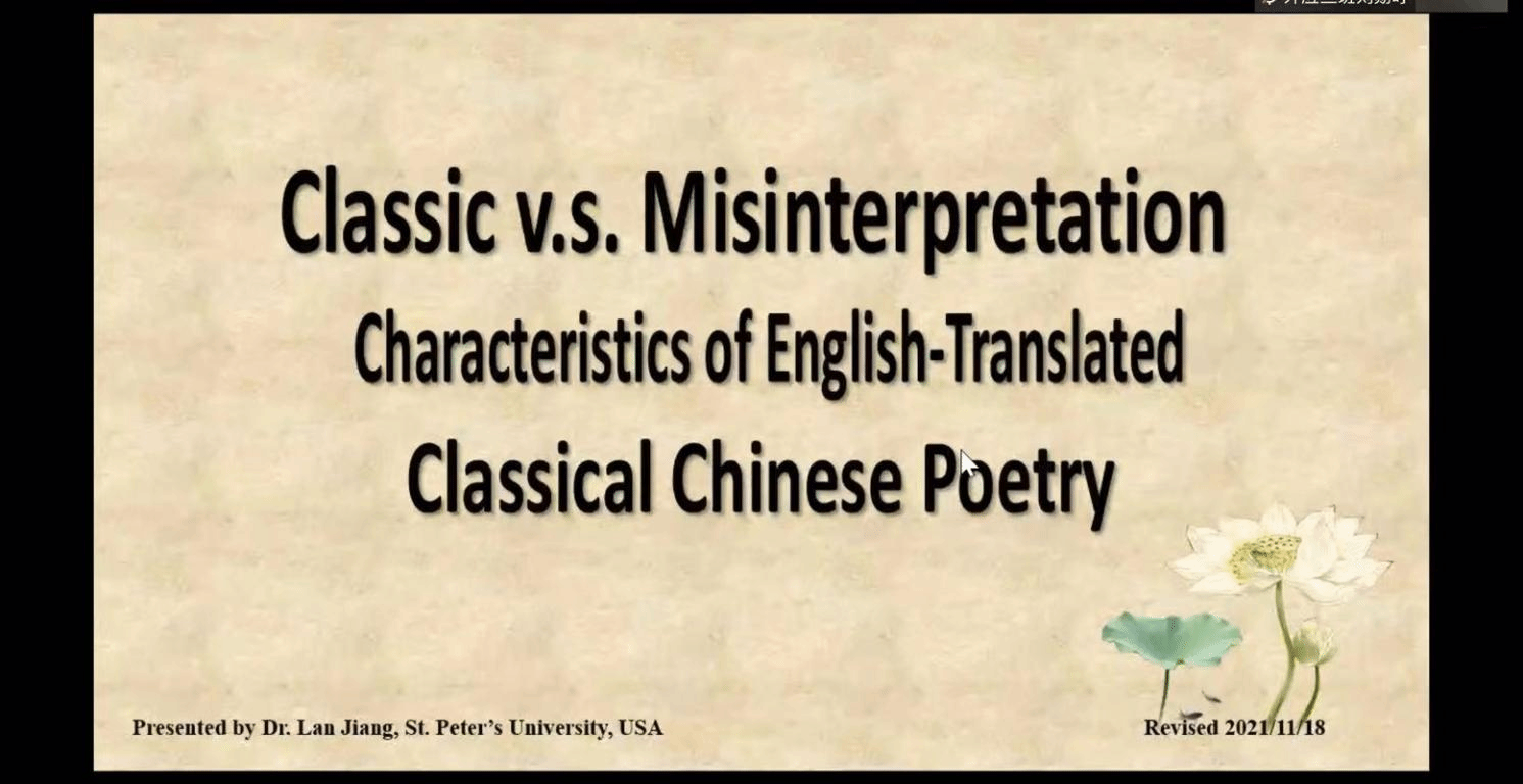 讲座围绕外国译者在对唐诗的英译过程中产生的误读进行分析解读。江岚博士首先从中国诗与歌的概念入手,指出中国诗歌最初是为了歌唱而创作的,诗歌的韵律美极为重要。随后,江岚博士通过比对如《答友问》,《越女词》等中国经典诗歌及其译作,对国外翻译作品中出现的误读现象进行分析与究因,指出诗歌翻译中存在的三大困难:形合,文化壁垒以及语言壁垒,以此让与会听众深入理解诗歌翻译中的文化与历史背景缺失所造成的误读。