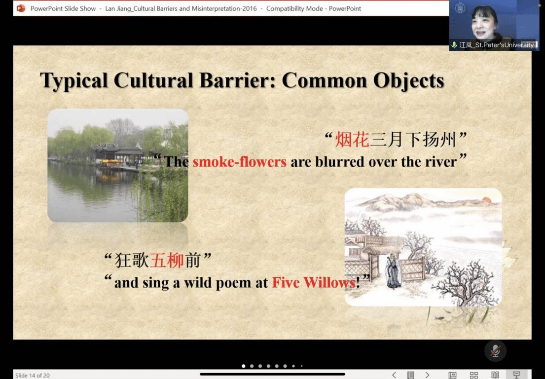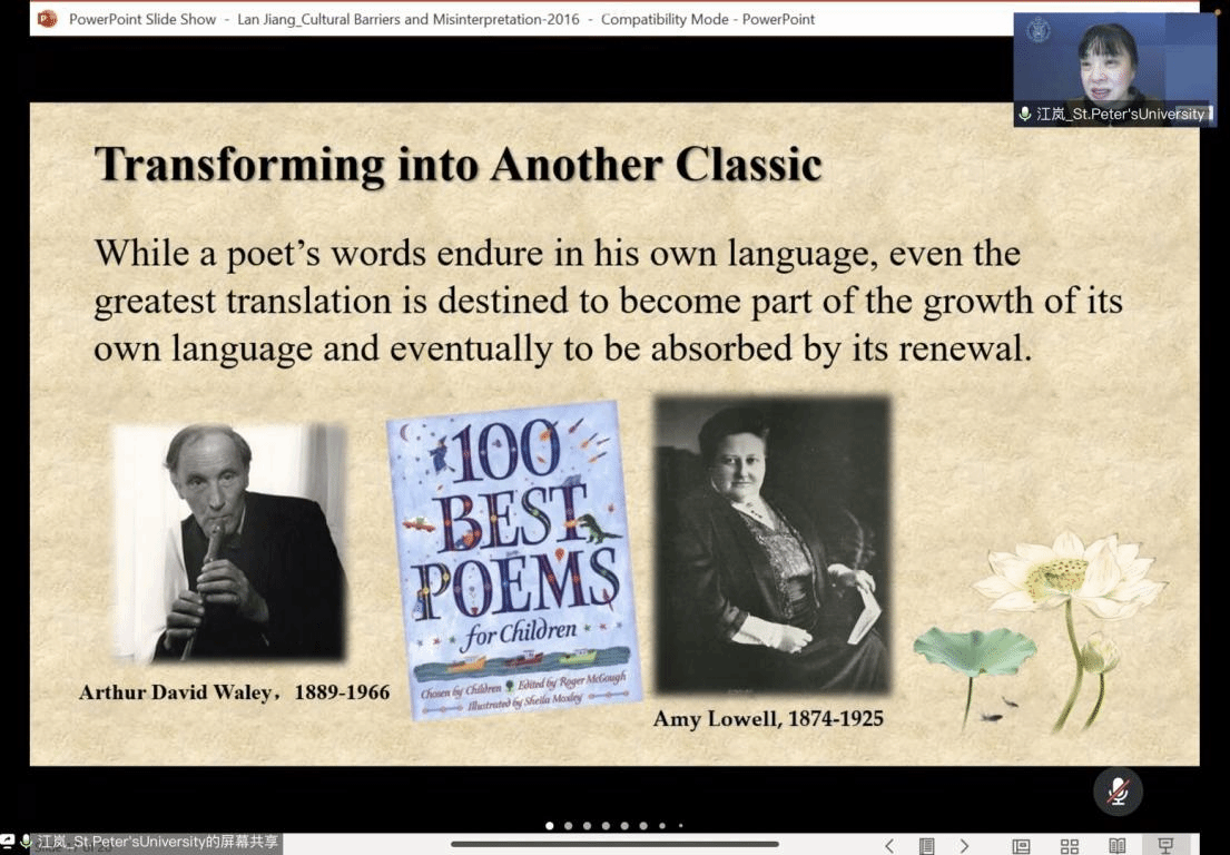 讲座上,江岚博士分享了众多国外知名译者的翻译风格与译作,如Herbert A. Giles、L. A. Cranmer-Byng、Arthur D. Waley等,并就这些译者的经典译文进行赏析。江岚博士强调“五柳”,“烟花”等具有特定指代的词语,不能对其直译,这样会误解或失去原作所表达的意思。江岚博士同时肯定,海外译者对中国诗歌的翻译虽然存在一定程度上的误读,但是作为不同语系的译者,他们的译作最终也在语言发展的路程中被汲取。因此,这些被误读的诗歌在一定程度上也成为了经典。