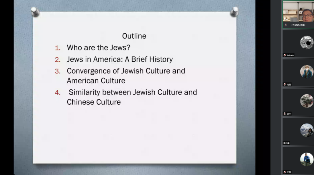 本次报告分为四部分进行:(1)犹太人身份认定;(2)美洲犹太人历史:(3)犹太人与美国人的文化结合;(4)犹太人与中国人的文化相似性。