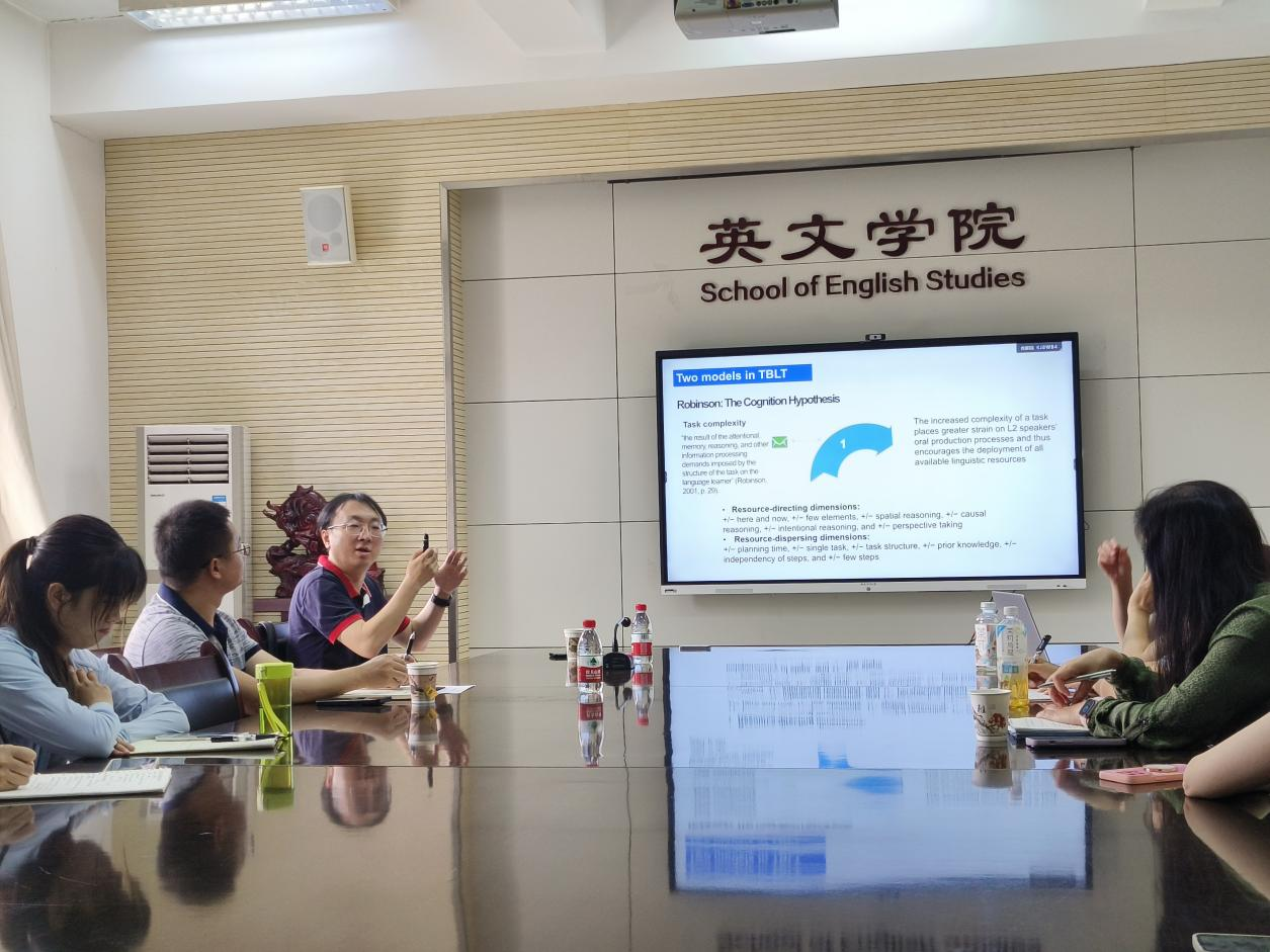 随后,任教授深入解读了其团队的研究成果——一篇题为“A Meta-analysis of the Effectiveness of Second Language of Pragmatics Instruction”的论文。该研究从听力视角出发,探讨了任务复杂度与序列对说话者口语产出的影响。经过实证研究发现,复杂任务能激发学生进行更多的话题转移与拓展,且简单任务与复杂任务的不同序列组合对学生的互动模式产生了显著影响。任教授的这一发现与Robinson2011)关于任务序列影响的假设相契合,进一步验证了任务型教学在二语语用互动能力发展中的重要作用。