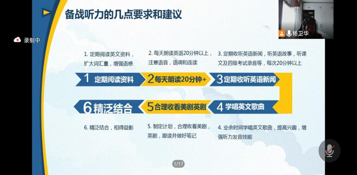 大学英语教学部的张迪晨、杨卫华、李晓恩3位老师通过线上腾讯会议于11月1日-4日举办大学英语四六级考试系列讲座。