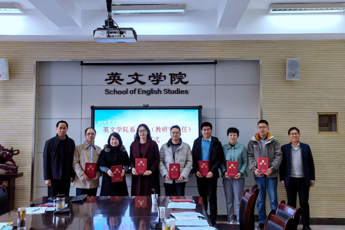 系主任(教研室主任)聘任的通知》,聘任薛小惠同志为英语文学系系主任,杨毅隆同志为翻译系系主任,马俊杰同志为语言学系系主任,苏锑平同志为国别与跨文化研究系系主任,林琳同志为写作教研室主任,张迪晨同志为大学英语第一教研室主任、徐斌同志为大学英语第二教研室主任。向各位新主任表示感谢和祝贺,与南健翀院长共同颁发了聘书。