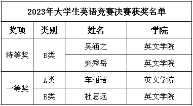 近日,2023年全国大学生英语竞赛决赛落下帷幕,我院学生喜获特等奖2项、一等奖2项。其中荣获特等奖的2名同学将获得代表陕西省参加全国大学生英语竞赛全国总决赛系列赛事活动的资格。