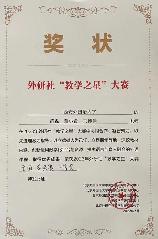 教师苗淼、董小希、王博佳代表陕西赛区参加了英语类专业组比赛。在第一个登场比赛的情况下,三位老师沉着迎战,凭借先进的教学理念、新颖的教学设计以及在教学设计介绍、课堂教学展示和现场问答三个环节的出色表现,获得英语类专业组全国总决赛二等奖的优异成绩。