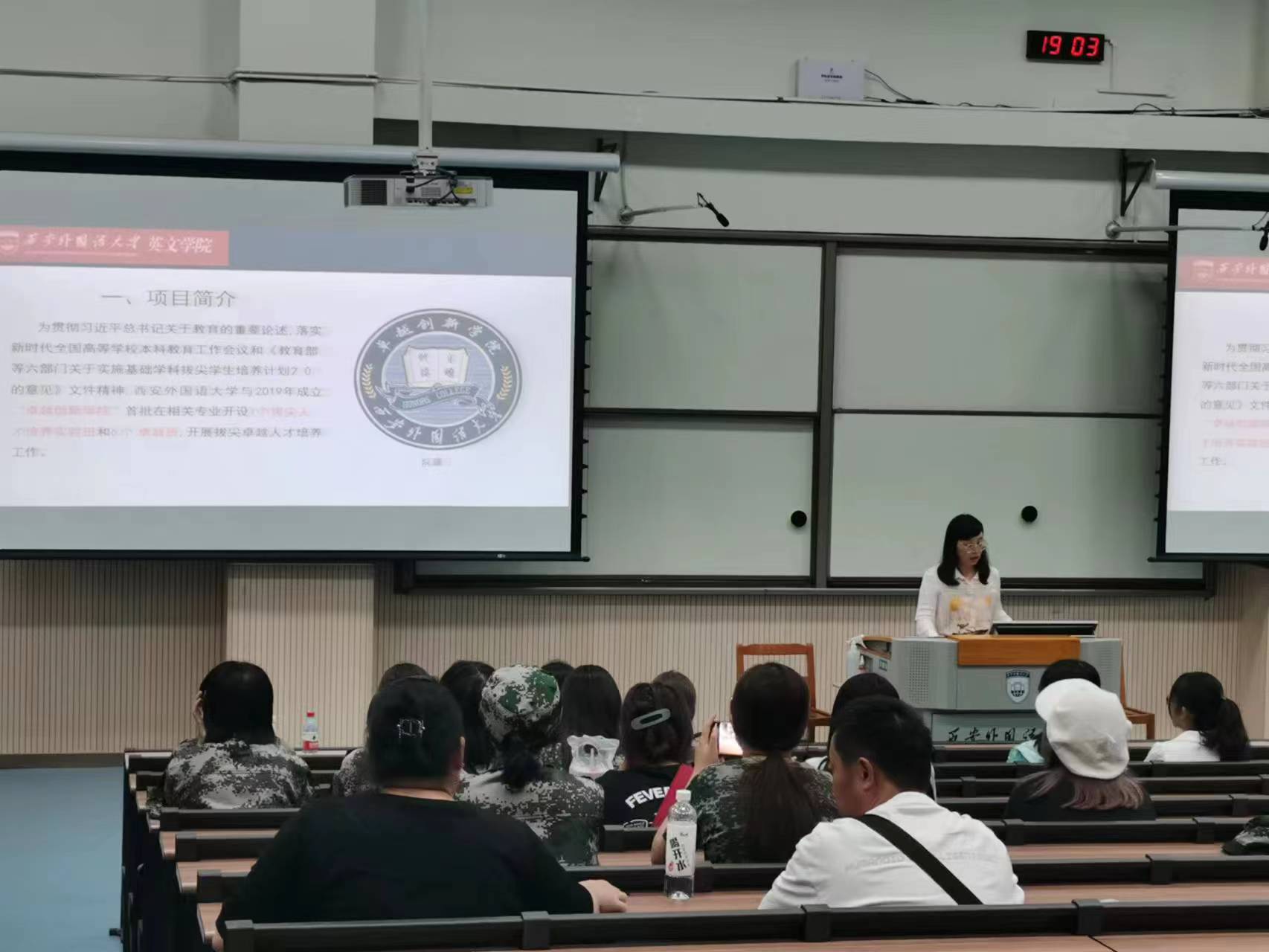 首先雷茜教授详细介绍两个实验班的具体情况,包括项目简介、培养目标、培养特色、课程设置、报名条件和选拔方式以及招生考试安排,让同学们对英语拔尖、卓越人才实验班有了全面的认识和了解。