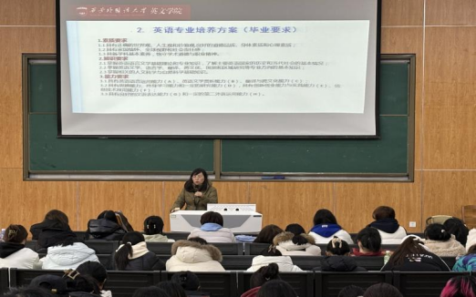 在长安校区实验楼SD107举办了系列讲座的第一讲——英语专业人才培养方案解读暨选课指导会。本次会议由副院长雷茜主持,2022和2023级英语专业全体学生参会。