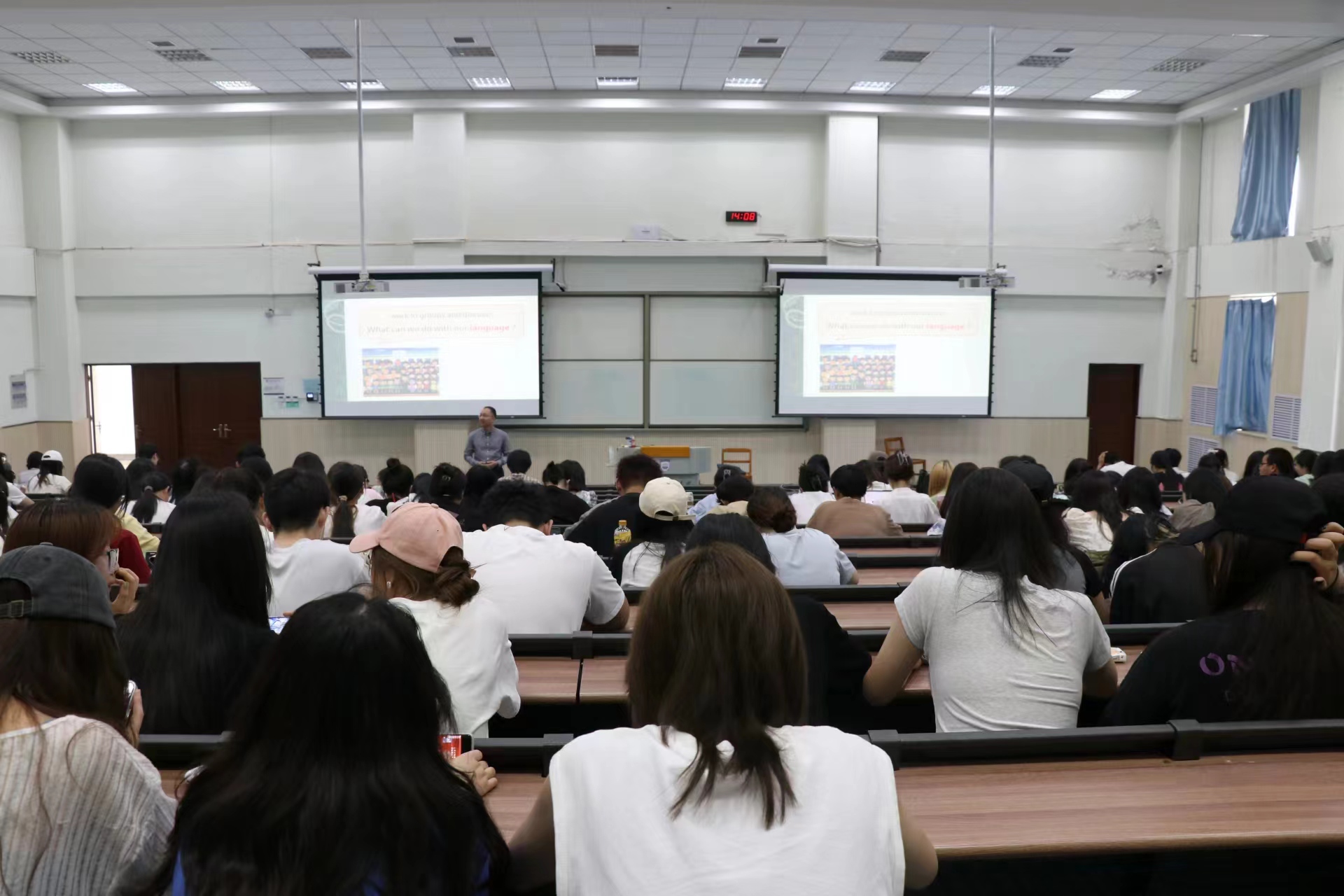 随后,他为同学们具体讲解了创新学分与学科竞赛的密切联系,介绍了英语专业的各类竞赛。讲解内容包括创新教育学分获得途径以及各竞赛对学生能力的要求。介绍了“外教社杯”全国高校学生跨文化能力大赛、全国大学生英语竞赛、大学生创新创业训练计划三大具体竞赛。董明老师的讲解形式多样,热情洋溢,他采用了展示幻灯片、播放视频、师生互动等方式,给全体学生留下了及其深刻的印象。本次讲座还邀请了香香漫画