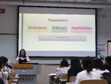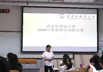 随后,雷茜老师宣布了比赛规则及流程。比赛内容为说课、现场教学和回答专家问题三个环节。每位教师的展示包括5分钟的说课和10分钟的现场教学,随后5分钟回答专家问题。大赛在五位老师的课堂展示中顺利进行,各位参赛教师课程内容准备充分,语言表达清晰有条理,教态自然,课件制作精美。同时,各位老师还将思政话题引入课堂,运用创造性的教学方法,积极渗透新的教学理念,通过线上线下双平台的教学来检验学生的课堂接收情况,突出了学生在教学过程中的主体地位,极大地调动了学生的学习积极性。