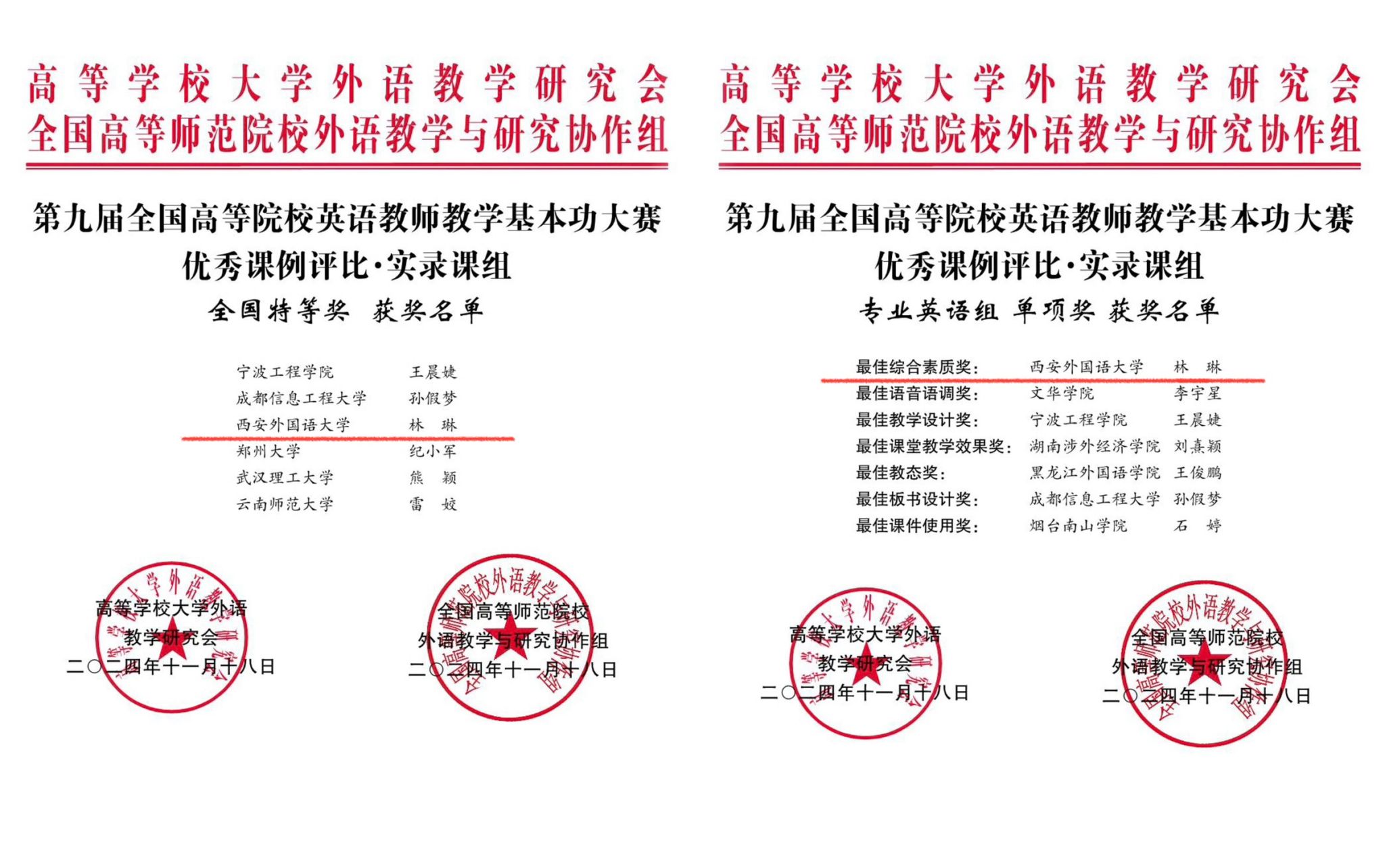 20241115-18日,“2024年全国高等院校英语教学学术年会暨第九届全国高等院校英语教师教学基本功大赛”在湖北武汉圆满落幕。经过三天的角逐,香香漫画 教师林琳成功斩获本次大赛实录课英语专业组“全国特等奖”和“最佳综合素质奖”两项荣誉;李婷、魏周、苏锑平和马丽萍分别荣获微课组“全国一等奖”“全国二等奖”和“全国三等奖”;李雨蒙获说课组“省级特等奖”。